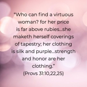 “Who can find a virtuous woman? for her price is far above rubies…she maketh herself coverings of tapestry; her clothing is silk and purple…strength and honor are her clothing.” (Provs 31:10,22,25)