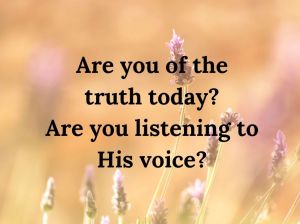 Are you of the truth today? Are you listening to His voice? “I am the way, the truth and the life; no man cometh unto the Father but by Me.” Jesus said it. John 14:6 If you have not yet done so, will you come to God through Jesus today?